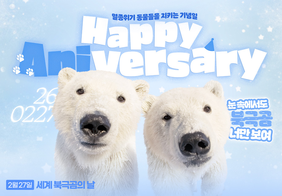 해피애니버서리의 첫 번째 주인공은, ‘북극곰’입니다. 2월 27일 ‘국제 북극곰의 날’을 맞아, 내년에도 그 다음 해에도 북극곰이 행복하길 바라는 마음을 전해주세요.