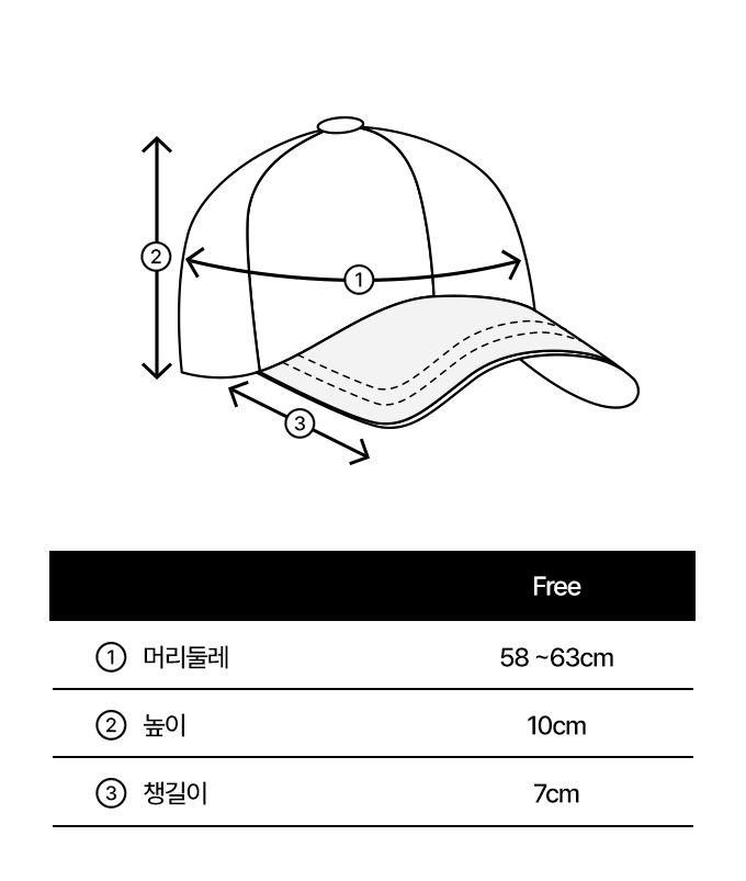 머리둘레 58~63cm / 높이 10cm / 챙 길이 7cm
